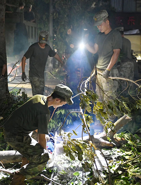 9月9日,在美蘭區海達路,中國人民解放軍75560部隊官兵100多人正在連夜進行路面清潔。(??谑腥诿襟w中心全媒記者 黃一冰 攝)