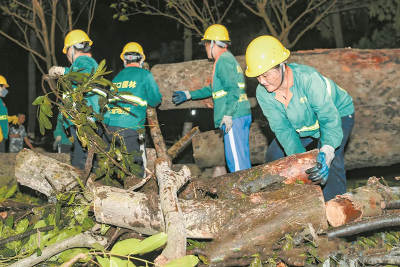 9月9日凌晨的???,許多人已經進入夢鄉,而??谑兄鞲傻狼逭瞎ぷ魅栽谶M行。市領導牽頭,全市以及三亞、瓊海、東方等市縣黨員干部下沉一線;部隊官兵、消防救援隊員、園林綠化工人、社區工作者、志愿者、群眾并肩戰斗,合力開展清障工作。