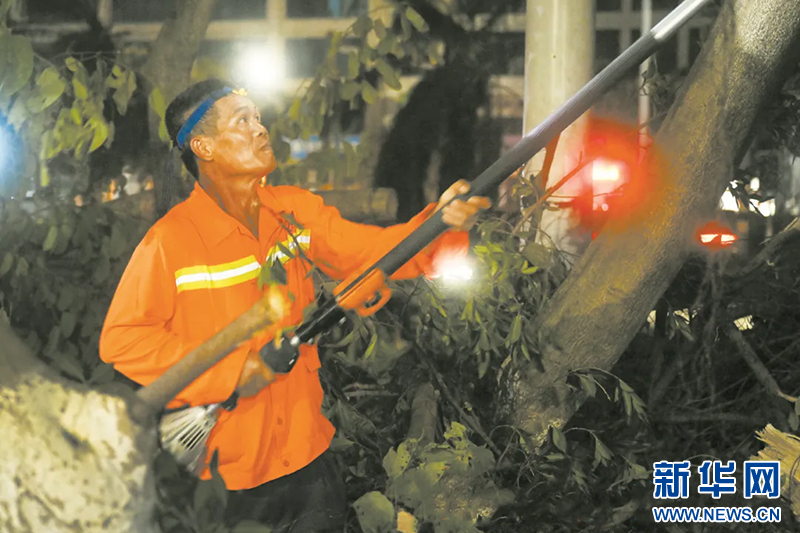 9月9日凌晨,瓊海市黨員干部在龍昆南路清理倒伏樹枝。新華網發(黃一冰 攝)