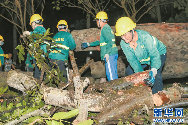 9月9日凌晨,在??跒I海大道萬綠園附近,園林綠化工人正忙著清理倒伏的樹木。新華網發(孫士杰 攝)