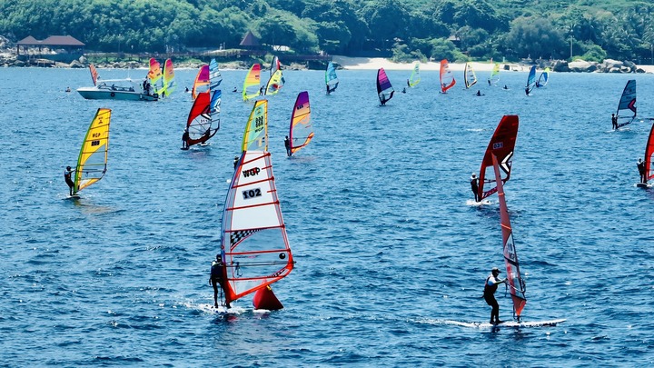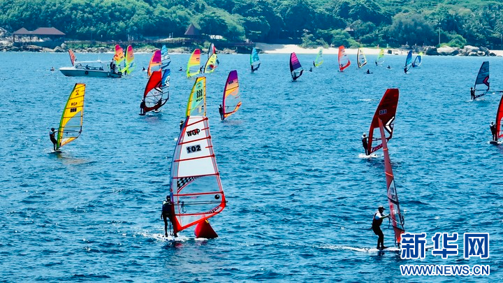 “太厲害了!”,在2024年國際旅游島帆板大獎賽現場,海面上帆影點點,多艘帆船帆板劈波斬浪,你追我趕。選手們立于帆板之上,用嫻熟的技術操控風帆,御風而行,時而傾斜身體保持平衡,時而加速滑行,吸引眾多游客拍照。