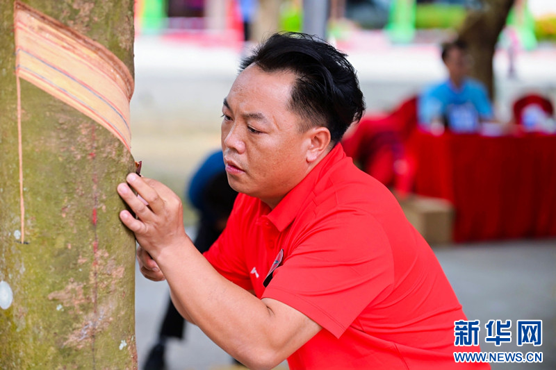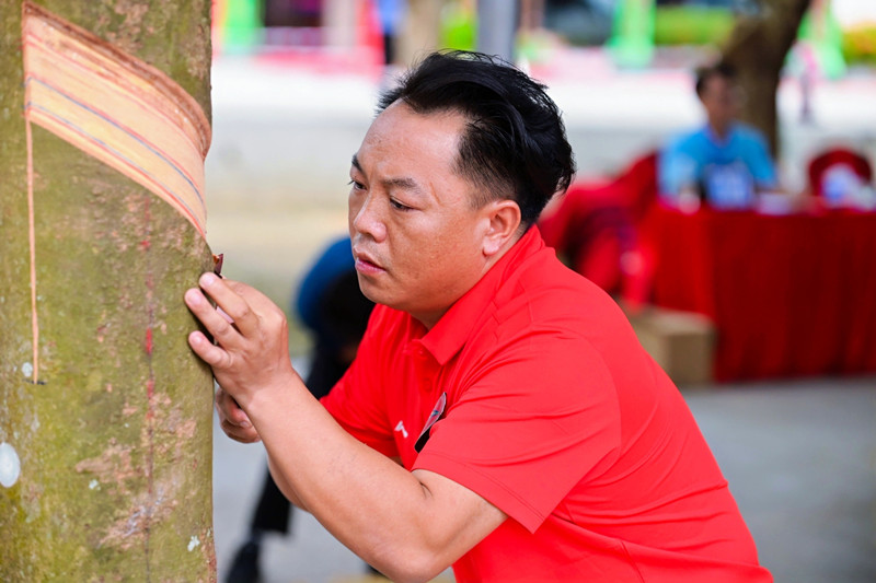 比賽期間,還同步開展了智能機械割膠演示、天然橡膠制品和特色熱作農產品展示等活動,吸引了眾多觀眾駐足觀看。這些活動不僅展示了我國天然橡膠產業的發展成果,也為割膠工們提供了一個交流學習、切磋技藝的平臺。