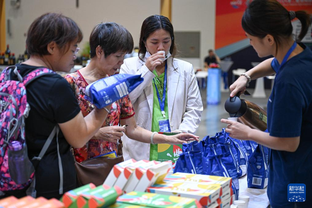 10月17日,觀眾在第二屆海南國際熱帶食材供應鏈博覽會上選購、品嘗食品。新華社記者 蒲曉旭 攝