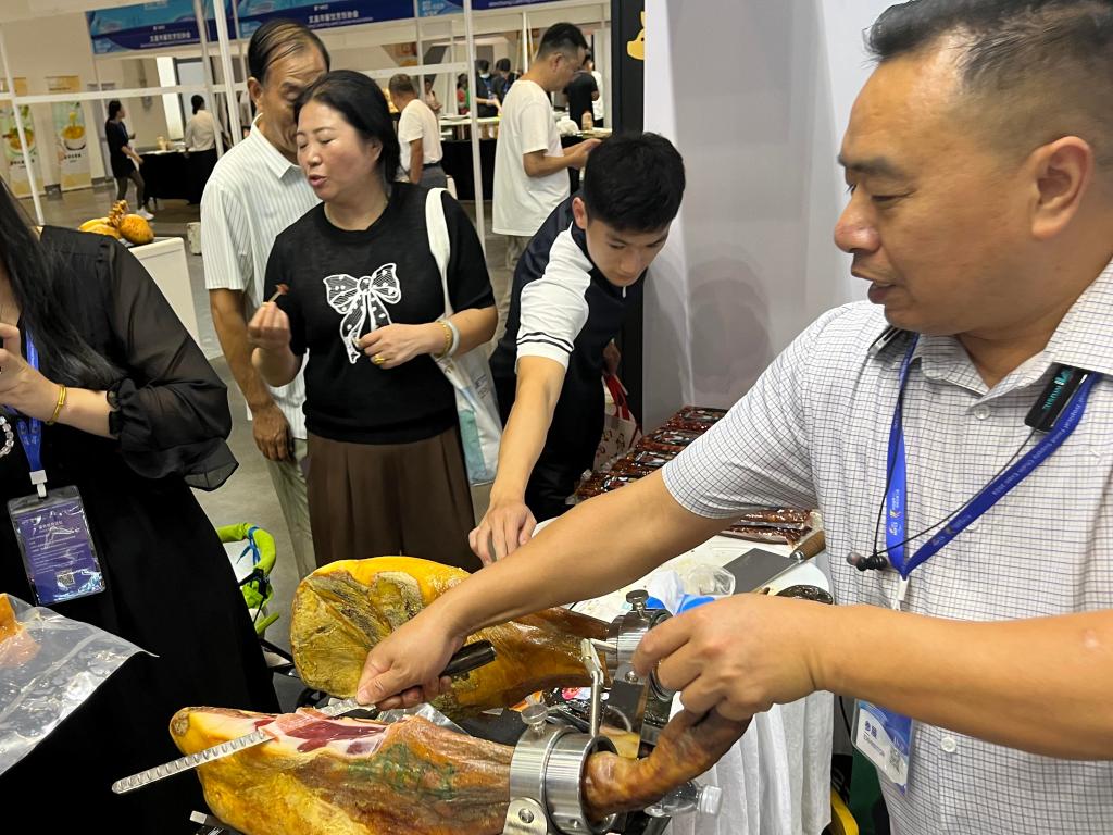 10月17日,在第二屆海南國際熱帶食材供應鏈博覽會上,觀眾品嘗用定安黑豬制作的火腿。新華社記者 羅江 攝