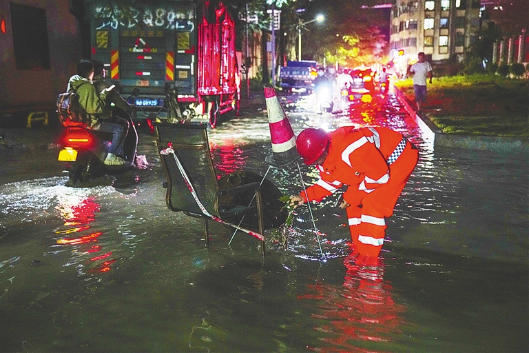 10月28日晚,三亞荔枝溝片區,排水工作人員清理下水道以便排水。海南日報全媒體記者 王程龍 攝