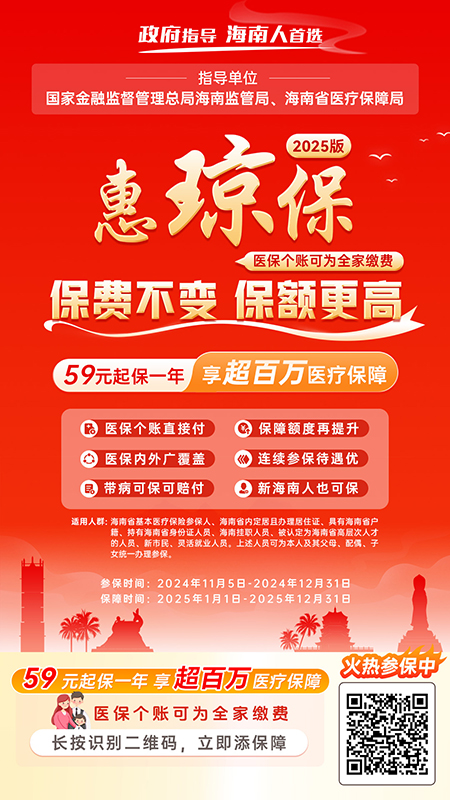 “惠瓊?!?025版參保不限年齡,新生兒及百歲以上老人均可保;不限職業,退休老人、高危職業均可保;不限健康狀況,參保無需體檢,帶病人群可??少r付。參保對象包括海南省基本醫療保險參保人、海南省內定居且辦理居住證、具有海南本省戶籍、持有海南身份證的人員、海南掛職人員、被認定為海南省高層次人才的人員、新市民、靈活就業人員,上述人員均可為本人及其父母、配偶、子女統一辦理參保。此外,職工醫保參保人可以使用醫保個賬余額為本人及配偶、父母、子女等近親屬投保,不占用額外現金。