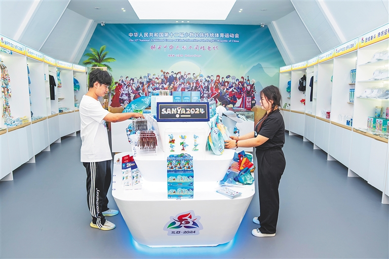 11月8日,在三亞灣紅樹林度假世界的第十二屆全國少數民族傳統體育運動會官方特許商品展示廳內,工作人員忙碌著擺放運動會特許商品。