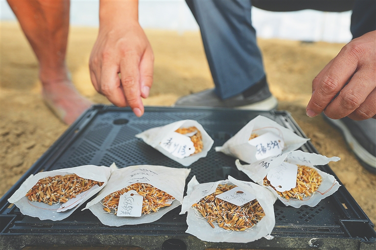 實驗大棚內,工作人員打開放置種子的白色棉布袋,小心翼翼地將種子放置在溫度、濕度穩定的環境中培育。