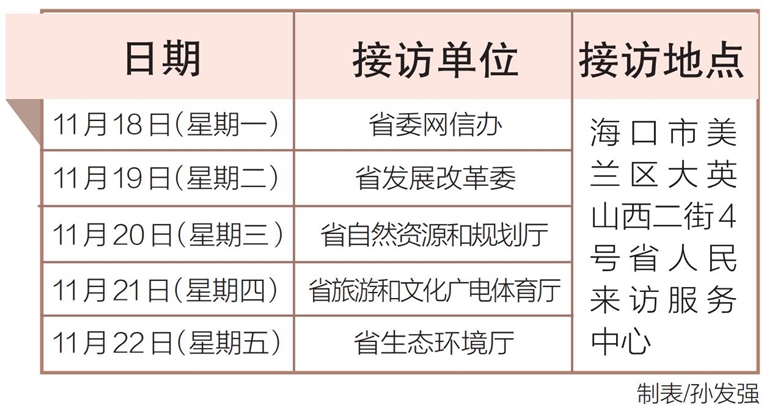 近日,海南省信訪局發布了省直屬單位領導11月18日至22日接訪日程。