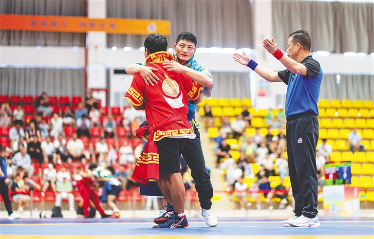 十一月二十四日,民族式摔跤項目比賽在三亞市一中體育館里進行,運動員精彩的表現引得現場掌聲不斷。比賽結束后,運動員擁抱致意。海報集團全媒體記者 劉孫謀 攝