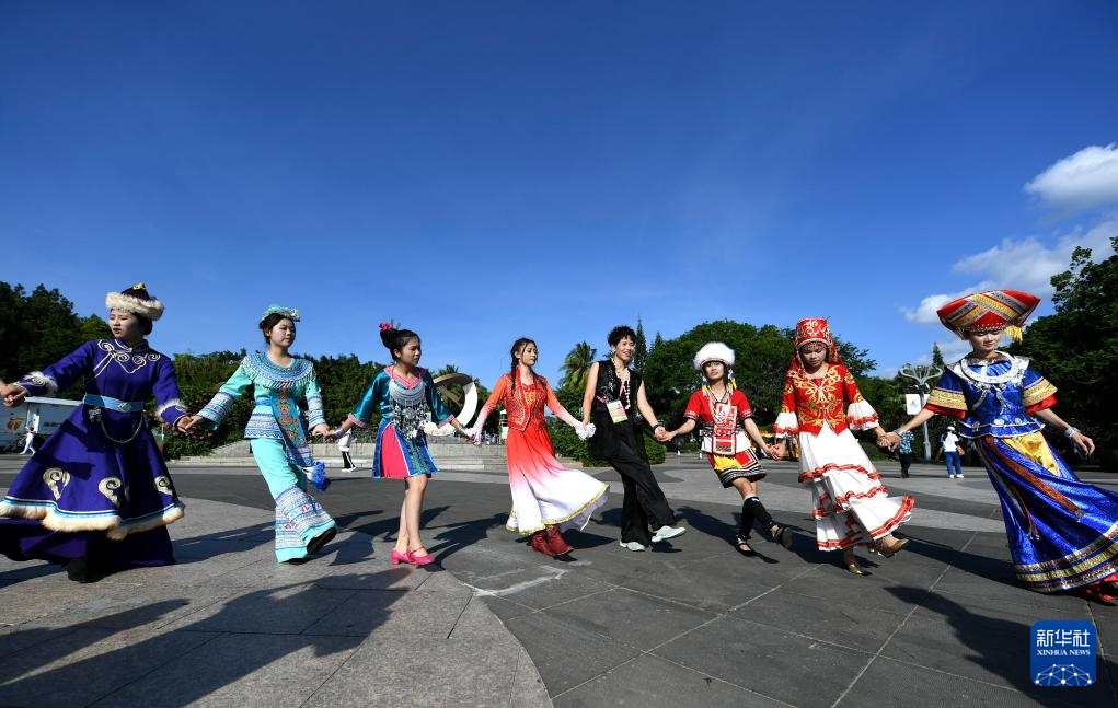 各區域的道路上,選手們攜手游園,海面泛起金光,照亮路上一張張歡快的臉龐。豐富多彩的民族服裝穿梭其間,如同雨林中百花盛開。