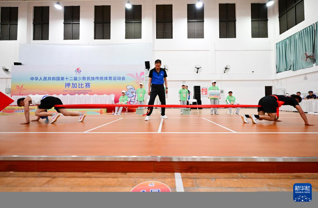 11月24日,新疆隊選手額熱斯別克·居馬德里(左)和云南隊選手陳趙龍在比賽中。當日,第十二屆全國少數民族傳統體育運動會押加項目55公斤級第一階段第三輪比賽舉行。新華社記者 周牧 攝