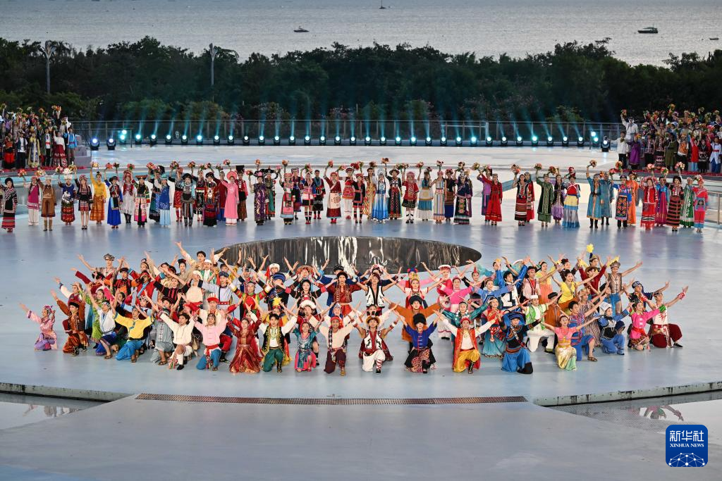 在“天涯海角星”紀念雕塑附近,臺灣少數民族代表團表演者身著特色民族服飾,手拉手圍成一個圓,在《我們都是一家人》的歌聲中,為觀眾獻上熱情舞蹈。不少代表團成員進入圓圈中,用手機將這份歡樂與溫馨定格。