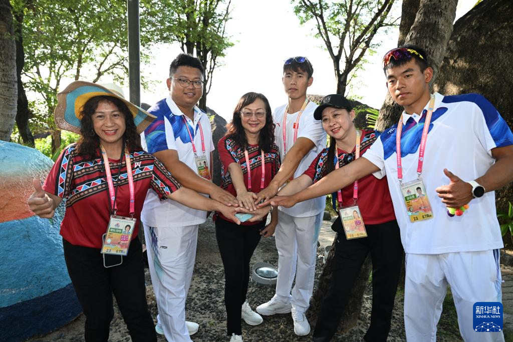 11月26日,臺灣少數民族代表團和云南代表團成員在活動現場合影。當日,第十二屆全國少數民族傳統體育運動會民族大聯歡活動在海南省三亞市舉行。新華社記者 周牧 攝