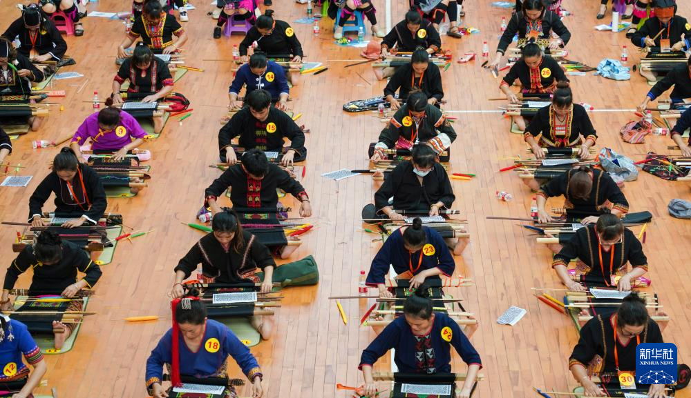 在海南省樂東黎族自治縣,選手們在技藝比賽現場編織黎錦(2023年4月23日攝)。新華社記者 樊雨晴 攝