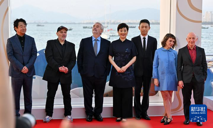 12月6日,導演呂克·貝松(左三)、演員徐帆(右四)、演員王景春(左一)、演員張譯(右三)等本屆電影節評委亮相電影節紅毯儀式。當日,第六屆海南島國際電影節在三亞開幕。新華社記者 郭程 攝
