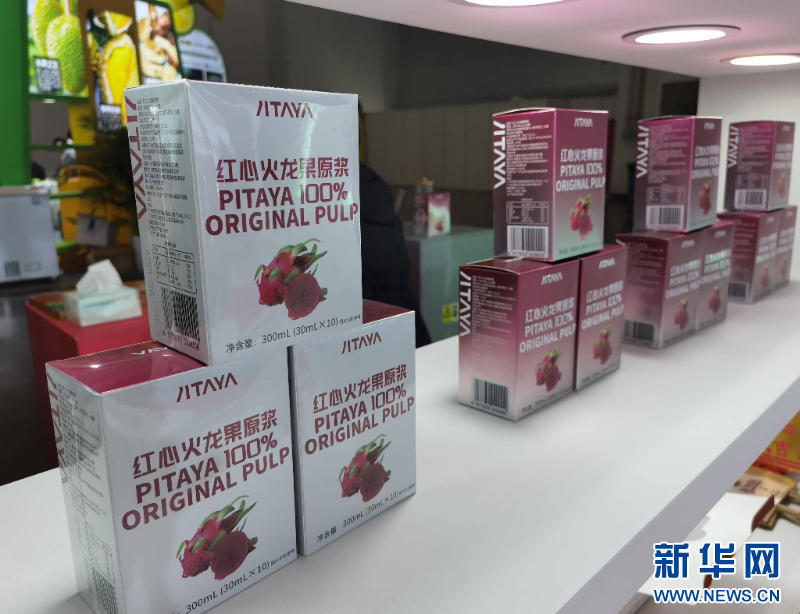 第27屆中國(海南)國際熱帶農產品冬季交易會火龍果全產業鏈館內展出的火龍果原漿產品。新華網 張瑜 攝