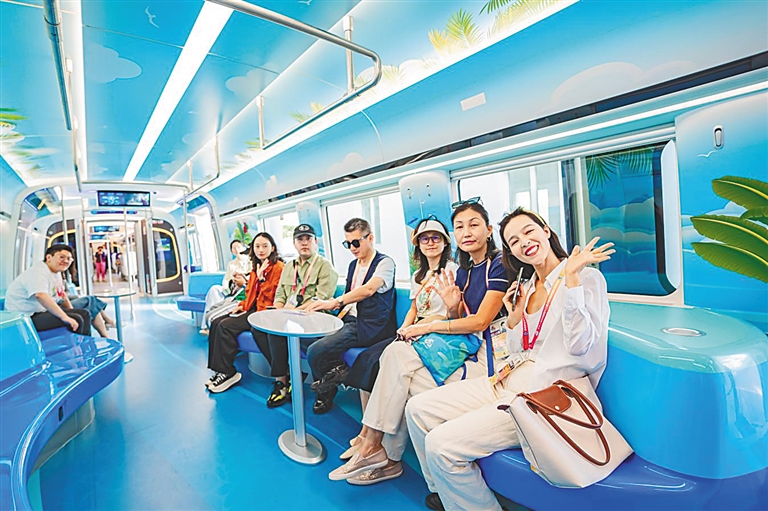 三樂旅游鐵路共有“鳳舞九天”“天涯海角”“回首之約”三個系列和“活力海洋”“椰風海韻”“走進三亞”主題車廂,動車組外觀內飾定制化設計融合了三亞特色,創意十足。同時,開創性地配備自助咖啡奶茶機、啤酒機、AI拍照打卡機,以及無線充電等智能服務設施,為市民游客帶來全新的乘車體驗。