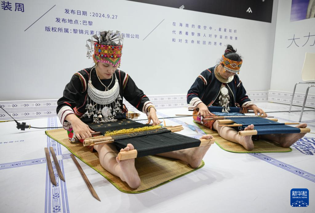 12月20日,黎族織娘在2024海南國際知識產權交易大會現場展示黎族織錦技藝。