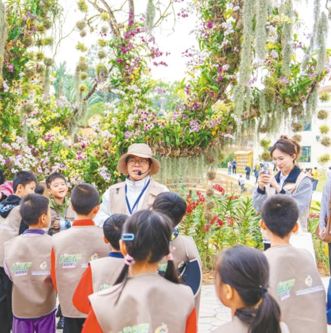 12月28日,七仙嶺全球熱帶水果博覽中心煥新亮相。圖為新增設的“植物寄生”展示區域內,工作人員給小學生們進行科普。海南日報全媒體記者 袁琛 攝