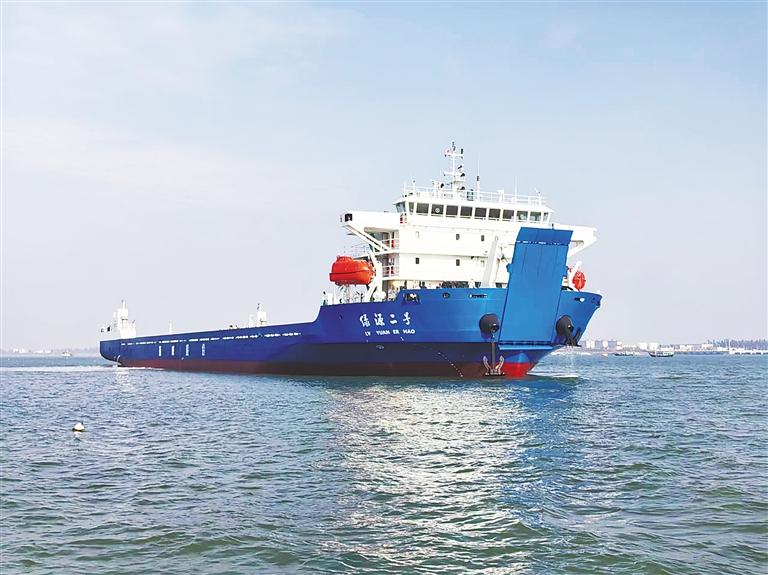 將于近日投入運營的瓊州海峽最大新能源汽車運輸專用船舶“綠源2號”。(??诤J戮止﹫D)