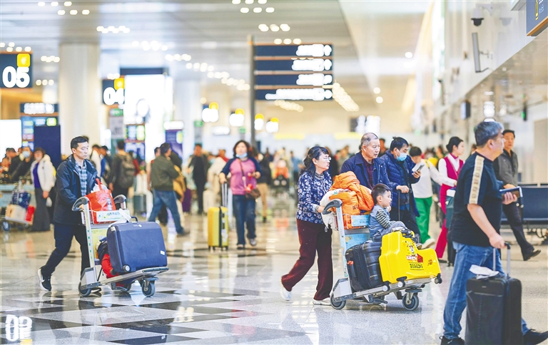 1月16日,在??诿捞m國際機場,到達大廳迎來一波又一波旅客。海南機場集團初步統計數據顯示,自1月14日春運以來,島內??诿捞m、三亞鳳凰、瓊海博鰲三大機場迎來客流高峰,執飛航班超3600架次,運輸旅客54.4萬人次。春運期間,海南三大機場預計執飛航班4.72萬架次,計劃運輸旅客約785.4萬人次,同比分別增長9.7%和2.6%;春運整體加班超過2200架次。