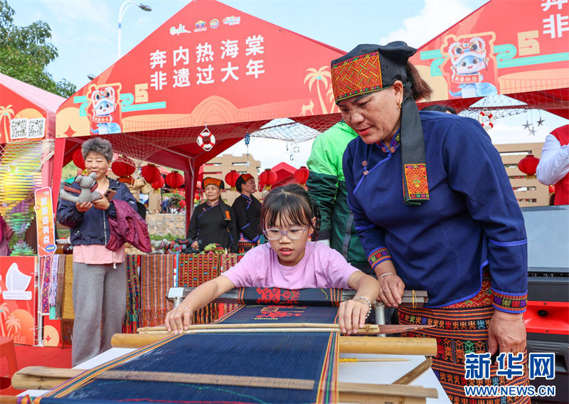 除了豐富的年貨和美食,“非遺技藝秀”專區成為了此次年貨節的一大亮點。今年適逢我國首個“非遺版”春節,主辦方特別邀請了多位本地非遺傳承老師坐鎮,現場展示黎錦、藤編、椰雕等傳統手工藝品的制作以及竹木樂器的演奏,老師們精湛的技藝和獨特的作品吸引了眾多市民游客駐足觀看,許多市民在專業老師的指導下,體驗了簡單的手工藝品制作和樂器試奏?,F場,來自三亞傳媒影視集團的主持人擔任非遺講解員,為觀眾介紹非遺作品背后的故事和文化內涵,更有非遺有獎競猜環節和竹竿舞互動、瓊劇經典呈現等非遺文化展演,讓市民游客切實感受到非遺文化的魅力。主辦方還邀請多位書法家在現場揮毫潑墨,通過“中國書法”這一非遺文化為市民游客送上春聯和福字,傳遞新春祝福和美好愿景。在互動游戲區,猜燈謎、投壺、套圈等傳統游戲也趣味回歸,為市民游客帶來別樣的新春體驗。