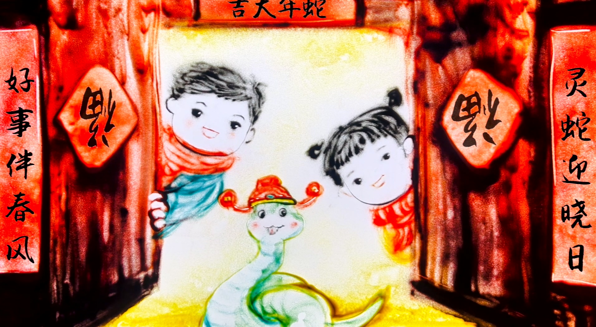 靈動的蛇形緩緩游走于細膩的沙粒之上,繪就一幅幅寓意吉祥、生機盎然的畫面。邀請每一位觀眾在欣賞沙畫之余,也能在心中種下一顆希望的種子,伴隨著春風的吹拂,共同迎接一個新春蛇年。