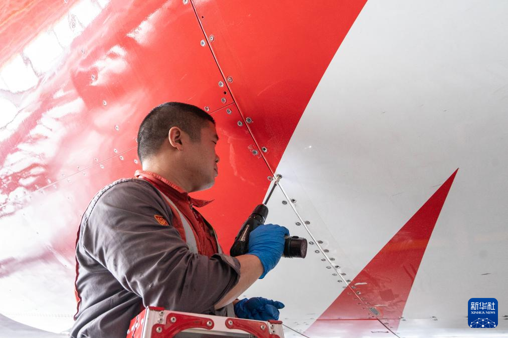 2月17日,在海南自貿港一站式飛機維修產業基地,海航技術旗下大新華飛機維修服務有限公司工作人員對進境飛機進行檢修。新華社記者 張麗蕓 攝