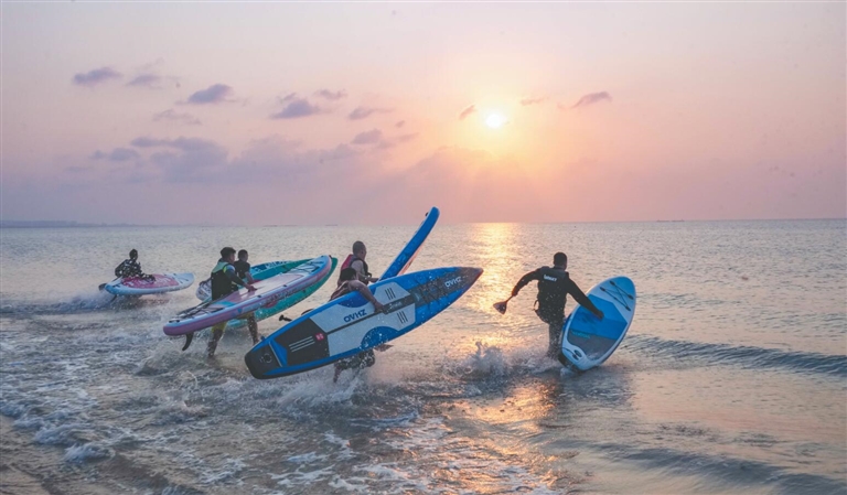 2月20日,??谑袠s山寮金沙灣公園落日下,游客在體驗水上運動。海南日報全媒體記者 陳元才 攝
