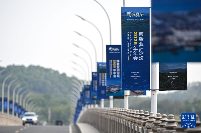 海南博鰲大樂大橋上的博鰲亞洲論壇2025年年會主題宣傳牌(3月20日攝)。新華社記者 蒲曉旭 攝