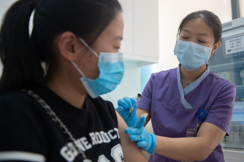 2020年4月3日,博鰲超級醫院的護士給一位女士接種HPV疫苗。 新華社記者 張麗蕓 攝
