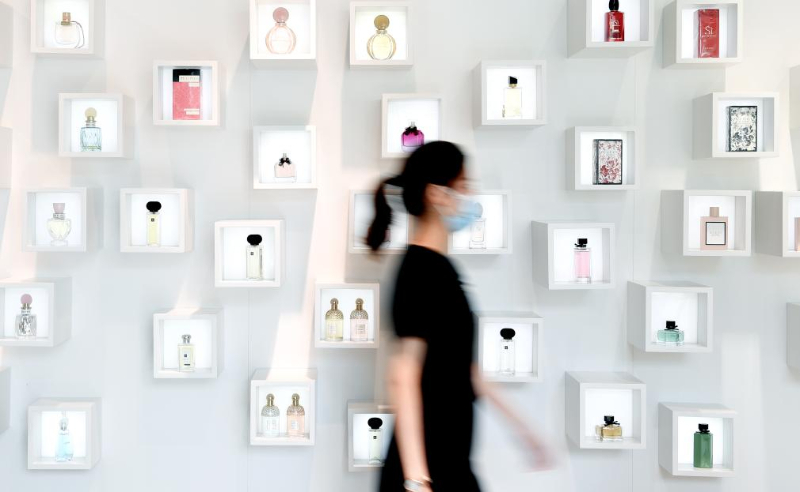 2021年4月19日,消費者從海南博鰲免稅店的香水柜臺前經過。新華社記者 郭程 攝