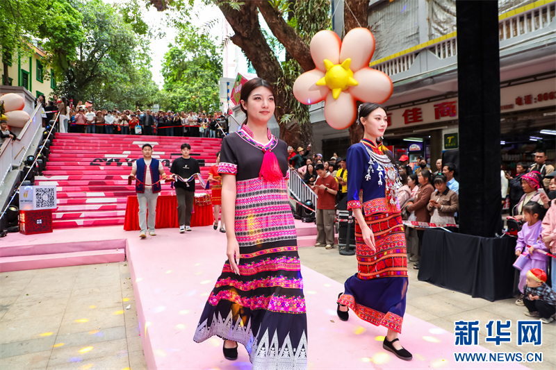 在五指山市解放路鴻鑫農貿市場旁,階梯鋪設布毯,巧妙搭建成走秀“T臺”,道路兩旁的香樟樹撐起了成片林蔭,一場黎錦非遺民族時裝“村秀”在城市主街區盛放,成為全城狂歡活動中的生動一幕。