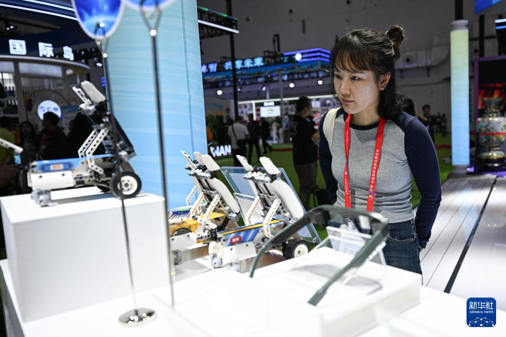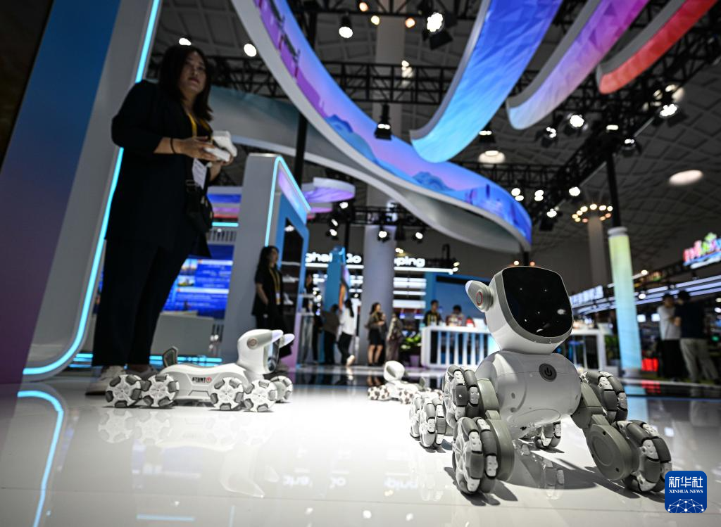 4月13日,工作人員在第五屆消博會北京展區進行遙控機器狗玩具演示。新華社記者 蒲曉旭 攝