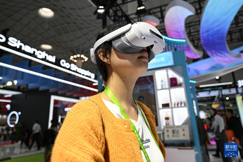 4月13日,觀眾在第五屆消博會北京展區體驗一款VR產品。新華社記者 蒲曉旭 攝