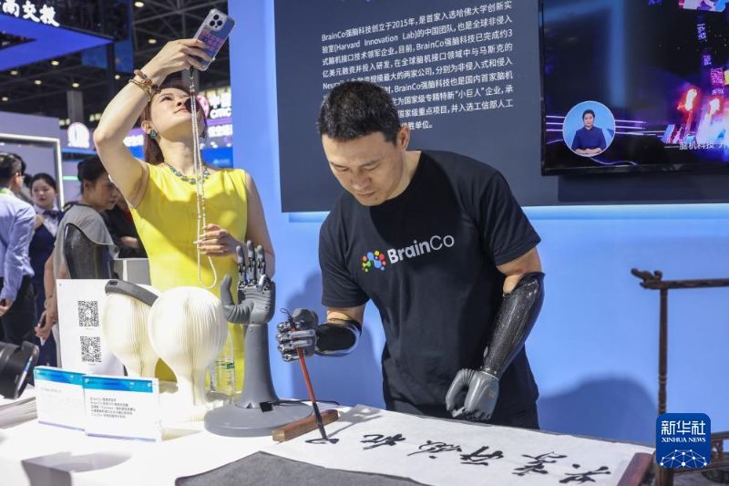 科技向善改變生活。在浙江強腦科技有限公司展區,工作人員佩戴智能仿生手彈奏出優美樂曲,用毛筆一氣呵成寫出“共享開放機遇”六個大字,令觀眾嘖嘖稱奇。