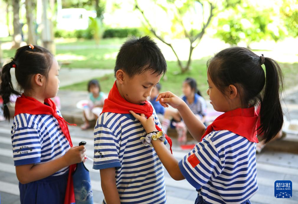 海南省三沙市永興學校的少先隊員們在“童心向祖國,我為祖國獻首歌”活動中佩戴紅領巾。(資料照片)新華社記者 樊雨晴 攝