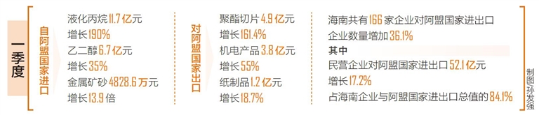 從??诤jP提供的統計中可以發現,海南正充分發揮資源稟賦優勢深度融入阿盟國家產業鏈,貿易規模不斷擴大。一季度,海南自阿盟國家進口液化丙烷、乙二醇、金屬礦砂等生產資料分別為11.7億元、6.7億元、4828.6萬元,分別增長190%、35%、13.9倍;對阿盟國家出口聚酯切片、機電產品、紙制品分別為4.9億元、3.8億元、1.2億元,分別增長161.4%、55%、18.7%,出口光伏產品、電動汽車等也大幅增長。