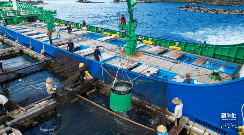 日本籍漁船在海南省萬寧市附近海域裝運章雄魚苗(5月15日攝,無人機照片)。