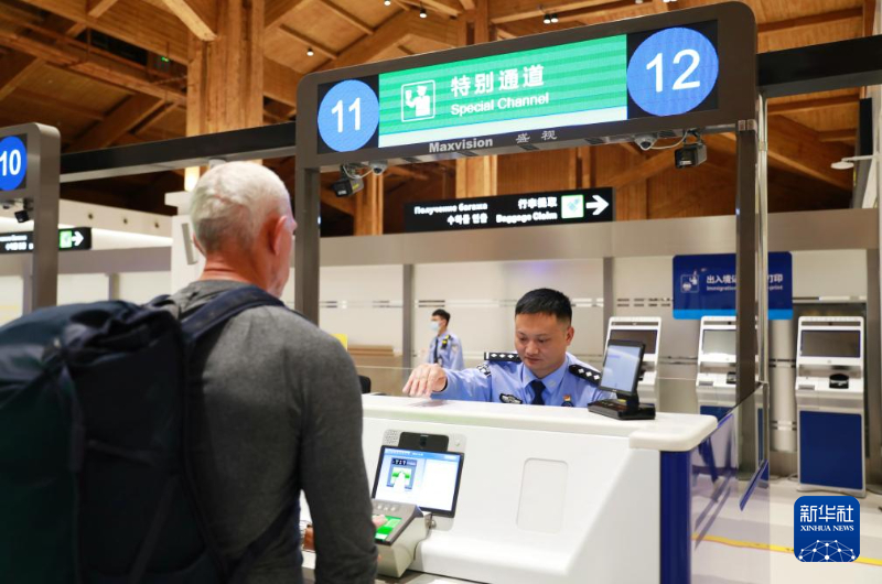 在海南三亞鳳凰國際機場,??诔鋈刖尺叿罊z查總站鳳凰邊檢站移民管理警察為參加2025LPGA藍灣大師賽的運動員、工作人員辦理入境手續(3月3日攝)。
