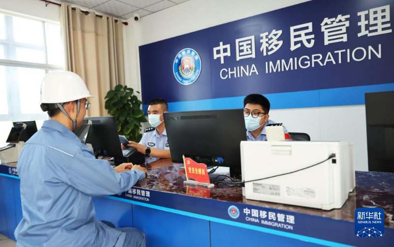 在??诔鋈刖尺叿罊z查總站洋浦邊檢站,移民管理警察為船員辦理換班手續(5月27日攝)。邊檢站通過在口岸指定地點設立聯合查驗區,將船員出入境檢查由“分散式”改為“集中式”,大幅縮短船員換班周轉時間。
