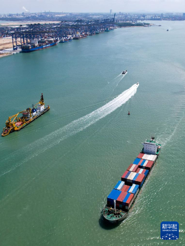 一艘集裝箱貨輪駛離海南洋浦國際集裝箱碼頭(5月28日攝,無人機照片)。