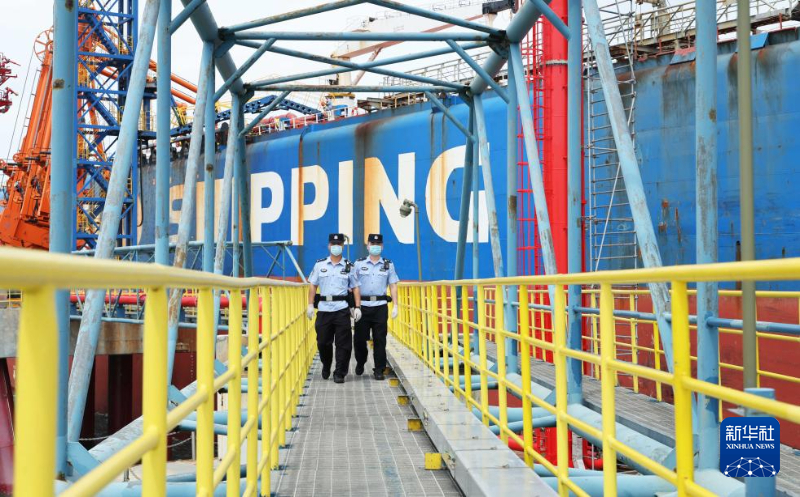 在洋浦港海南煉化原油碼頭,??诔鋈刖尺叿罊z查總站洋浦邊檢站移民管理警察對外籍船泊進行巡查(5月27日攝)。