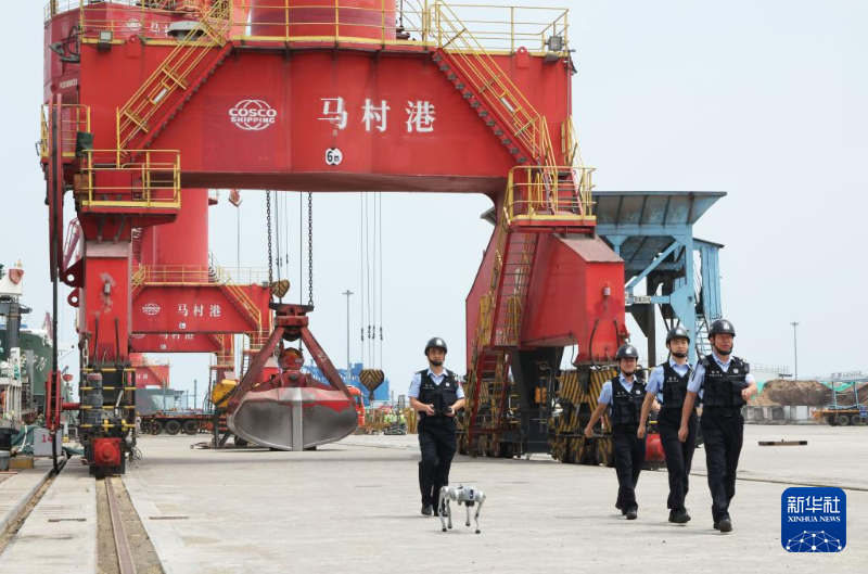 在海南省澄邁縣馬村港碼頭,??诔鋈刖尺叿罊z查總站馬村邊檢站移民管理警察借助機器狗進行巡查(5月26日攝)。