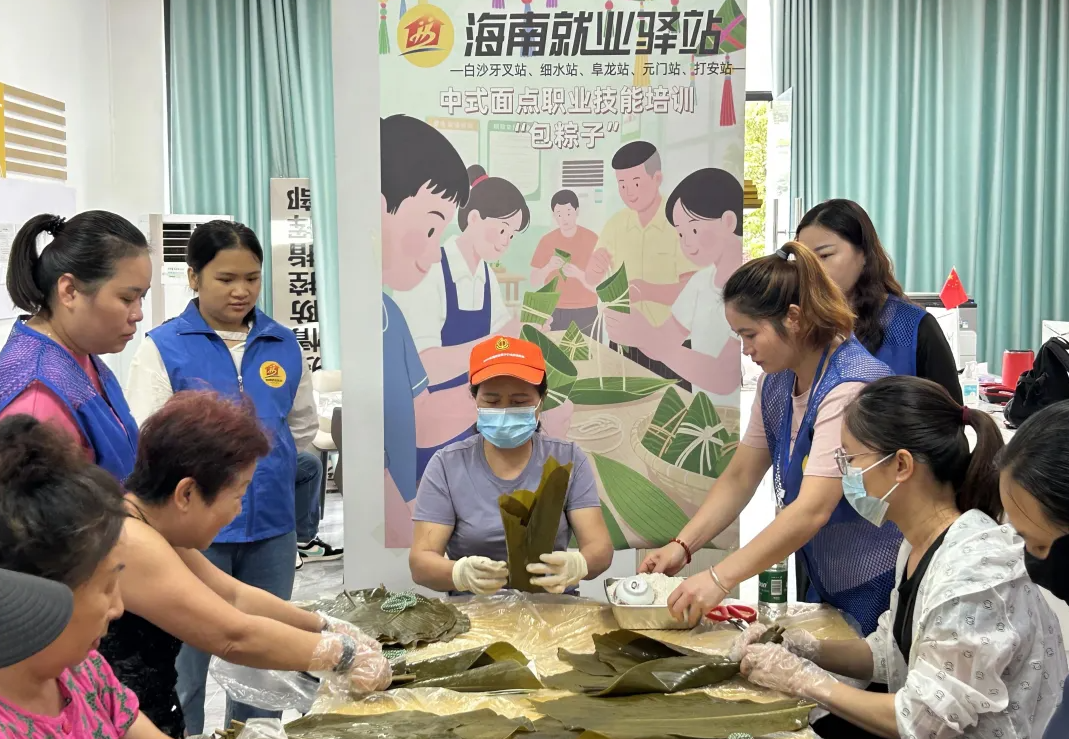 在印有“獨樂樂不如‘粽’樂樂”字樣的橫幅映照下,學員們從粽葉挑選、糯米浸泡,到餡料調配、包制捆扎與火候掌控,系統學習傳統粽子制作技能。這是5月28日,白沙黎族自治縣牙叉鎮一場“中式面點職業技能培訓——包粽子活動”的場景。