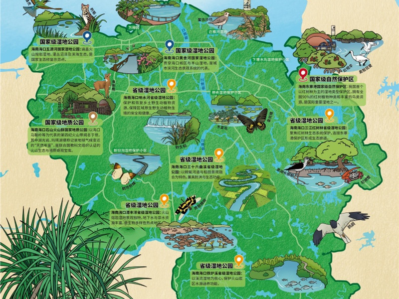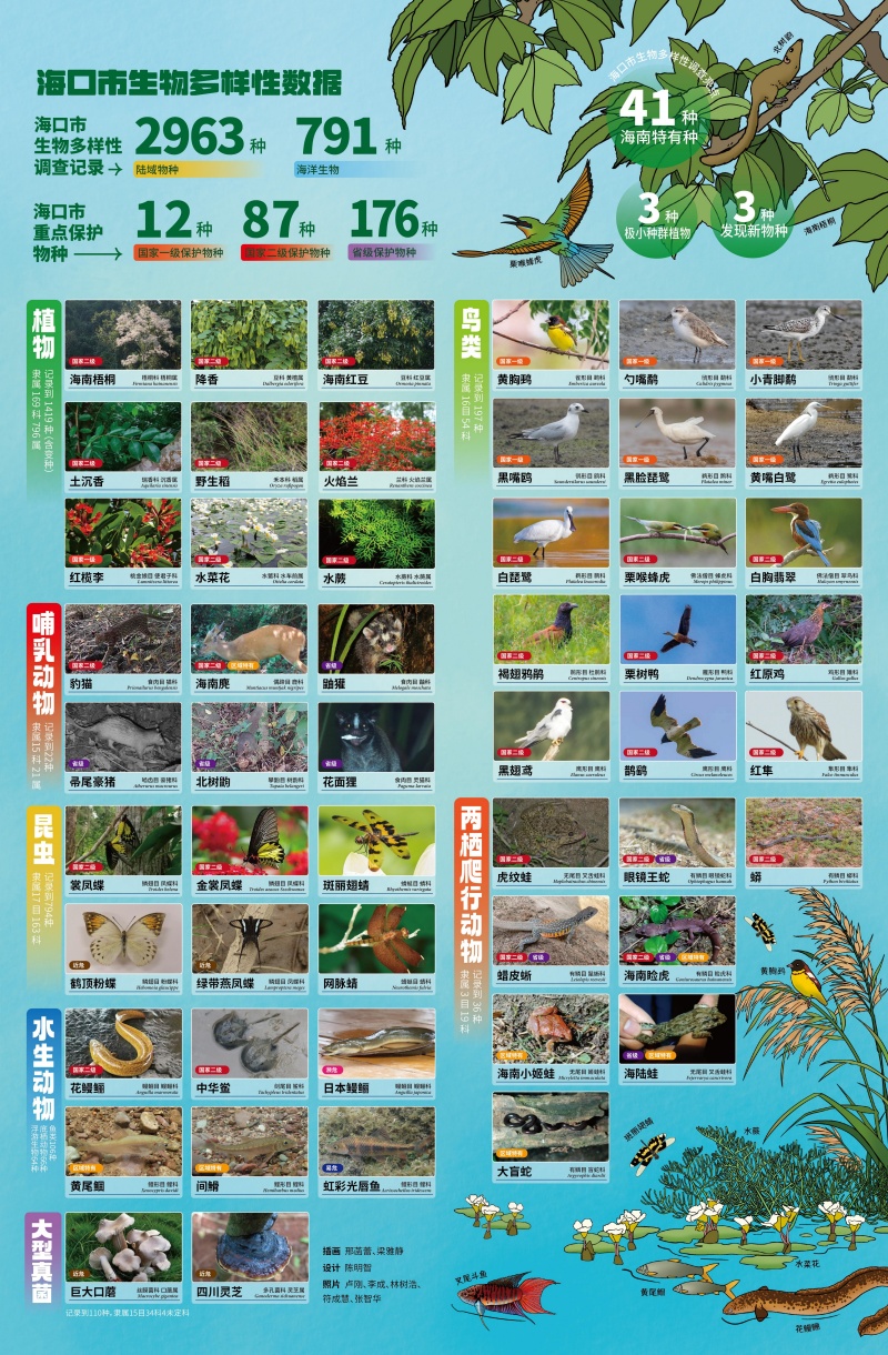 該地圖正面繪制???大生態保護地、重要生態熱點地區及典型物種分布,包括海南東寨港國家級自然保護區、海南??谖逶春訃覞竦毓珗@、海南??诿郎岷訃覞竦毓珗@等;背面則標注了??谑猩锒鄻有灾饕獢祿?、7大類52種典型物種,形成市民自然探索手冊。