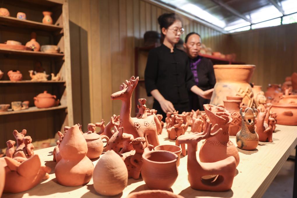 6月9日,在海南三亞黑土黎陶合作社里,村民董佳佳和她的外婆胡其梅查看黎陶產品。