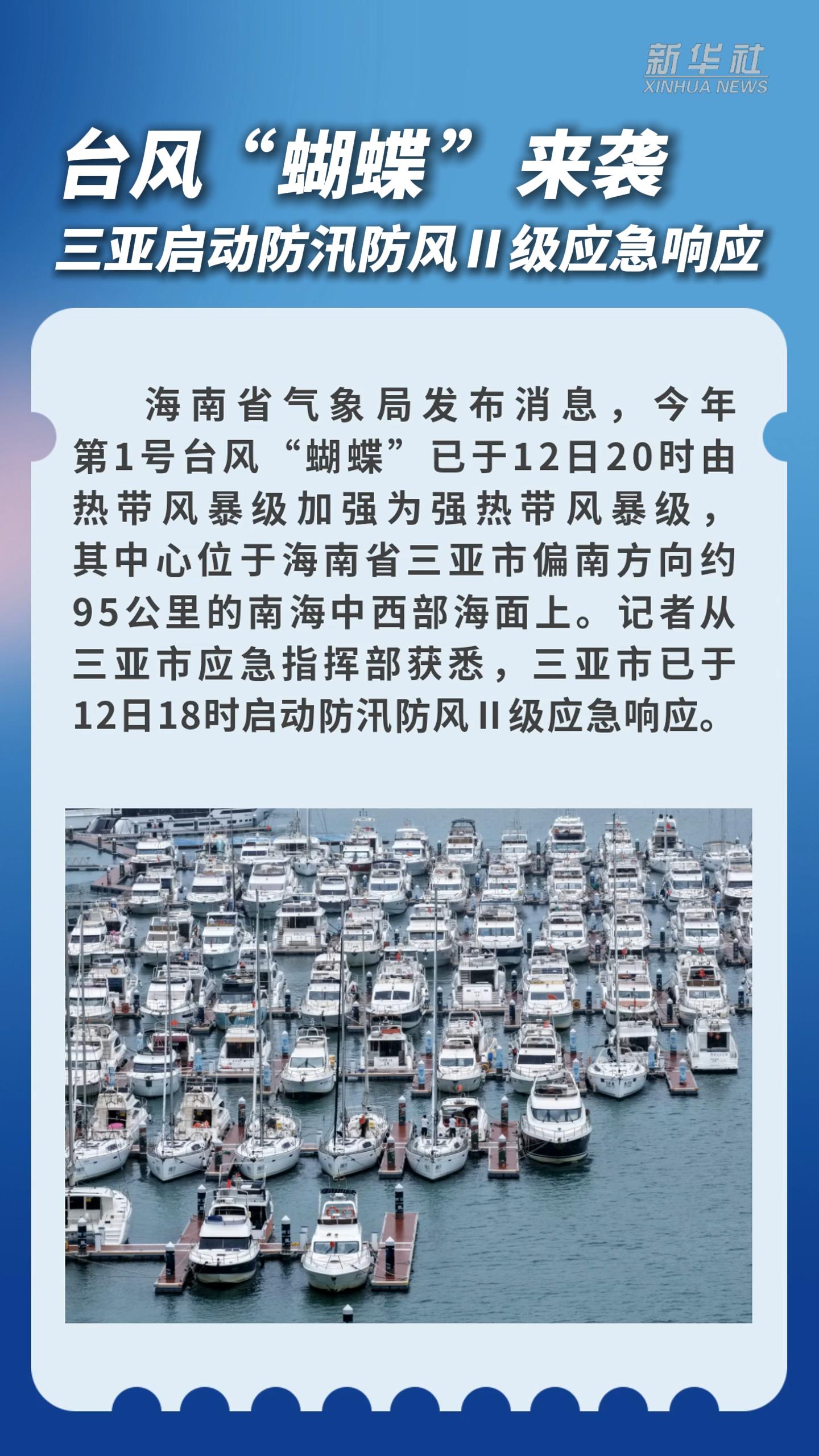 海南省氣象局發布消息,今年第1號臺風“蝴蝶”已于12日20時由熱帶風暴級加強為強熱帶風暴級,其中心位于海南省三亞市偏南方向約95公里的南海中西部海面上。記者從三亞市應急指揮部獲悉,三亞市已于12日18時啟動防汛防風Ⅱ級應急響應。