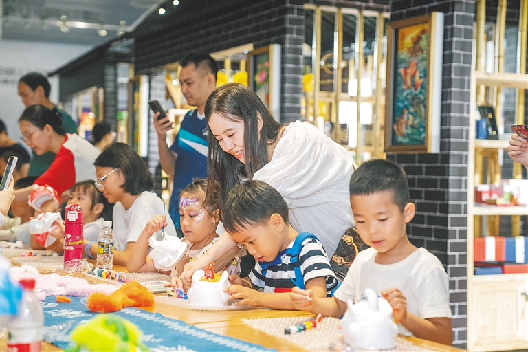 “孩子放暑假后,我常帶他來非遺展示中心,既能躲躲暑氣,又能參與活動、感受傳統文化的魅力?!泵χf,夏日午后孩子總想出外玩耍,博物館、文化館、圖書館這類文化場所便成了她的首選,“在這里參加些活動,涼快又充實,孩子也能學到不少東西?!?/p>